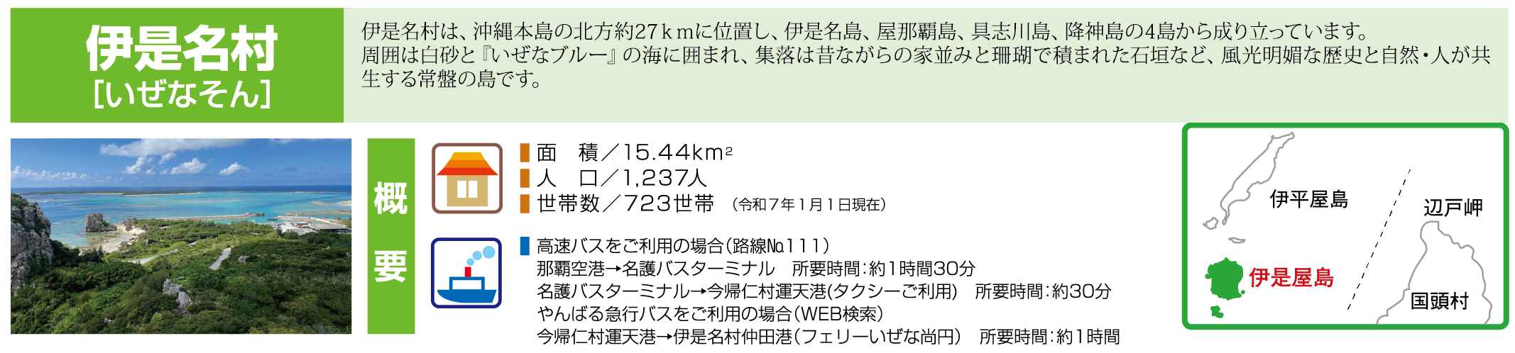 伊是名村は、沖縄本島の北方約27kmに位置し、伊是名島、屋那覇島、具志川島、降神島の4島から成り立っています。