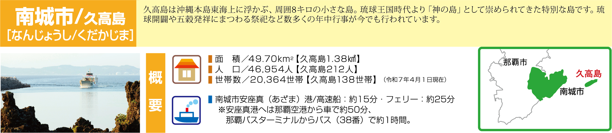 平成18年1月1日に、1町3村(佐敷町・知念村・玉城村・大里村)の合併により誕生しました。那覇空港から40分圏内にある市域は、緑豊かな自然環境に囲まれ、離島である久高島は、神の島、琉球民族発祥の地として崇敬されています。