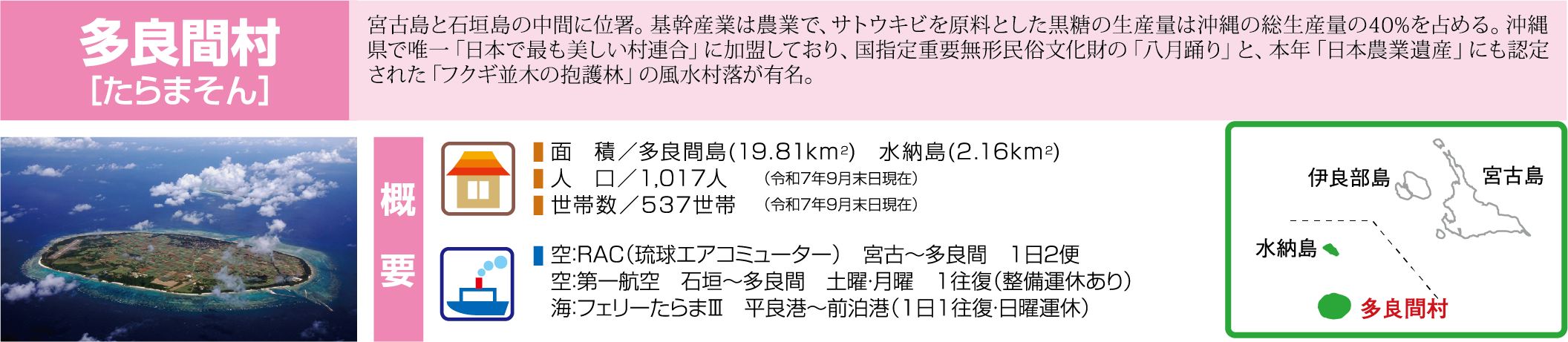多良間村は、多良間島と水納島の2島からなる村です。宮古島と石垣島のほぼ中間に位置します。
